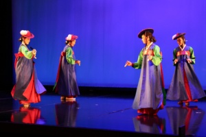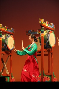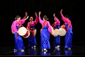 韓国の伝統楽器である長鼓を肩に掛けて、多様なリズムを叩き、興にのりながら舞う舞です。